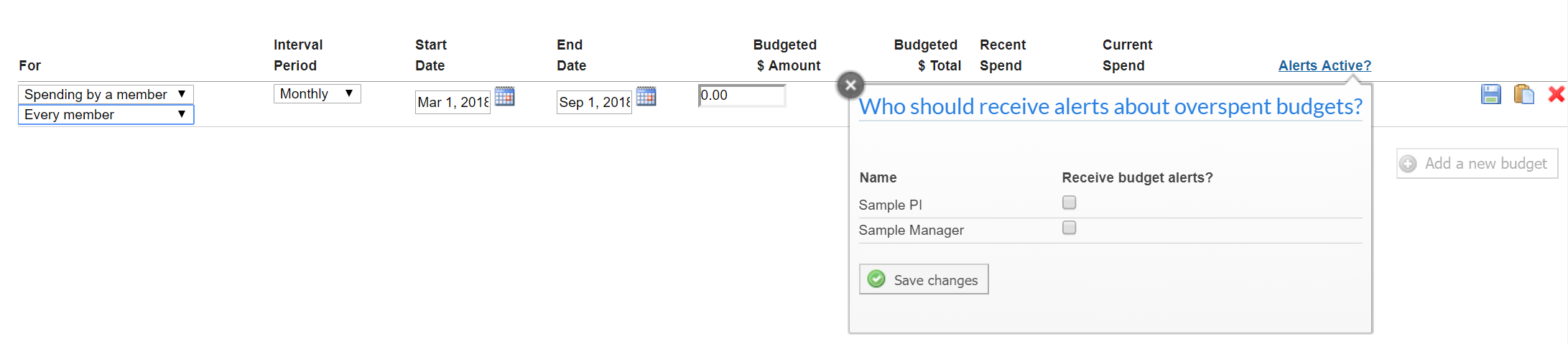 - Alerts Active?: When you click on the Alerts Active? link, a new window displays. This window displays every financial contact within the lab. Check the box next to their name if you would like them to receive notifications when budgets are nearly met. Once you have made your selection, click save changes, then click the X to exit the window. You can pause alerts by clicking on the pause button once administrators are set up to receive alerts.
