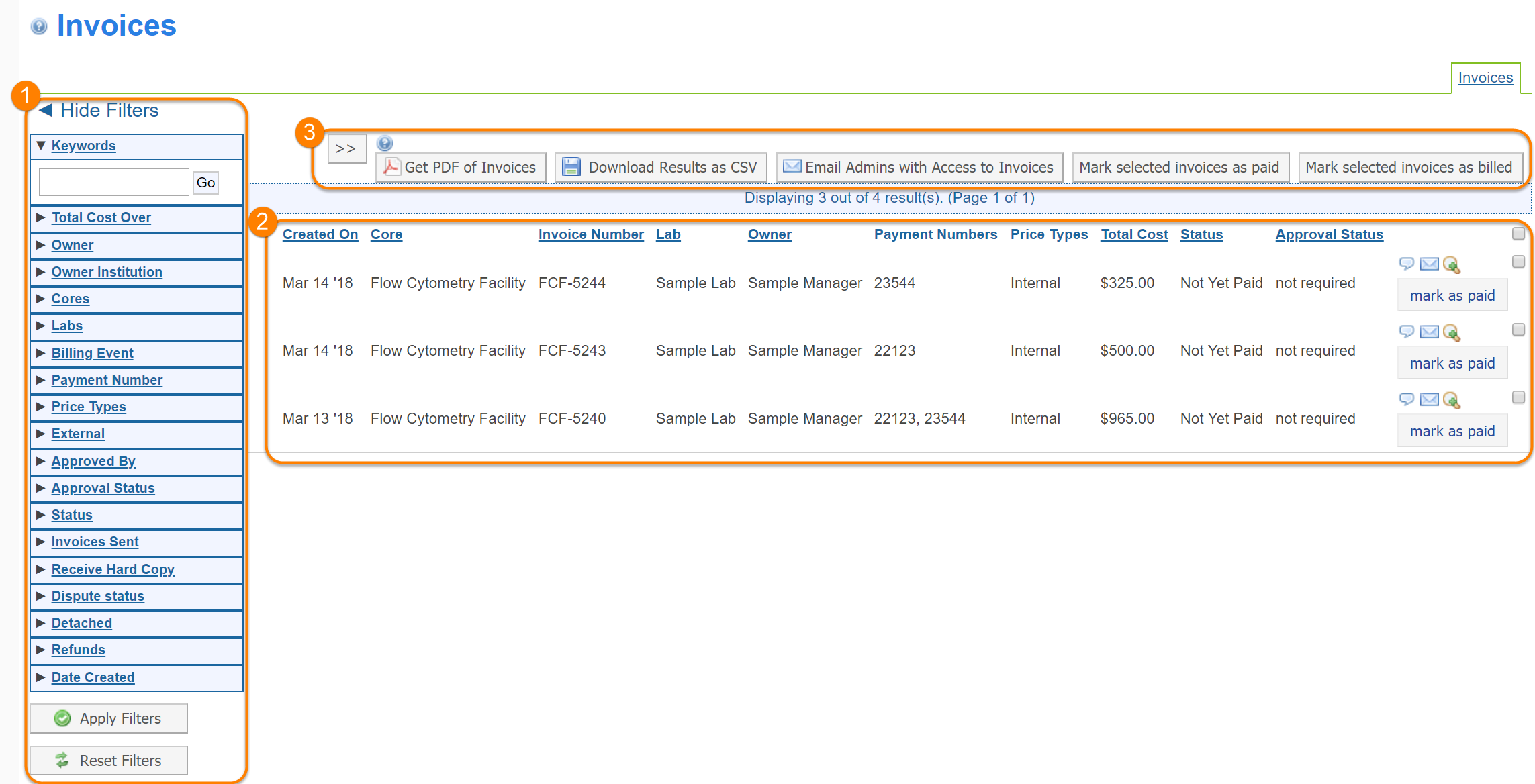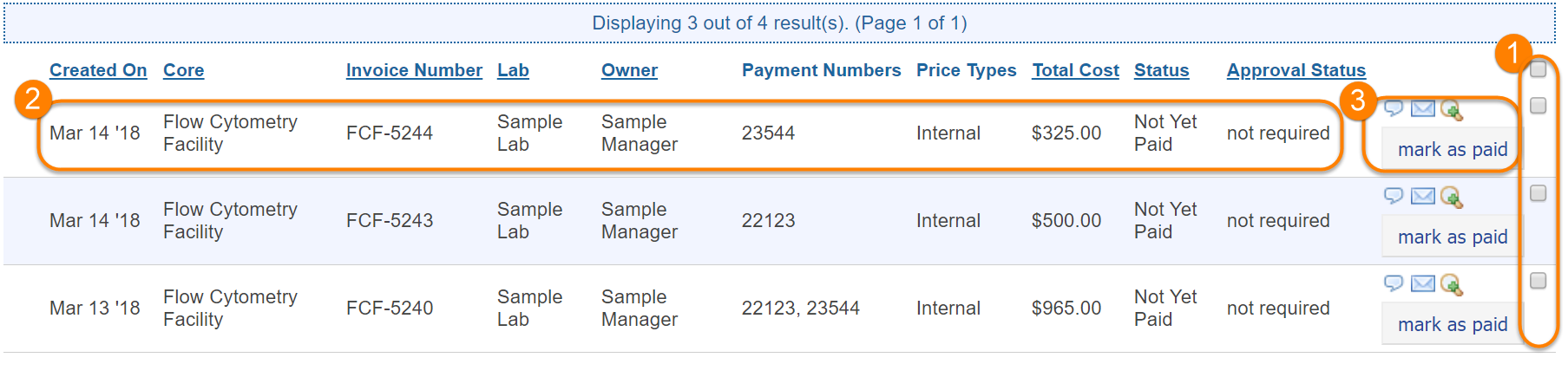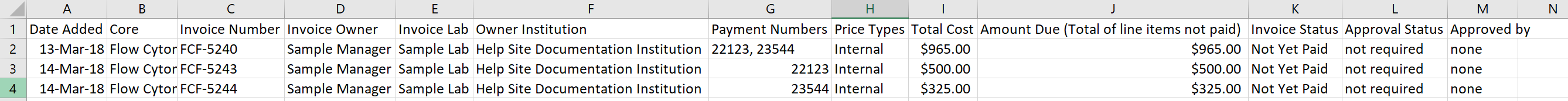 - Approval Status: Certain institutions require that the lab formally approves the invoice. In these cases, the approval status is listed in this column. Otherwise, it will show as not required.