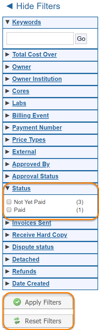 You can filter invoices on a wide variety of other attributes using the Filters panel. If the filter panel is not visible, click on the "Show filters" link in the upper-left. To use filters, use the black arrow to the left of each category to expand the filter you would like to search on. Then, select from the available entries.