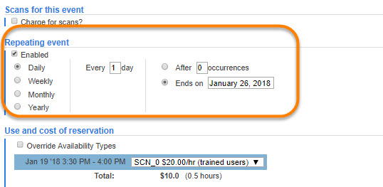 When reserving a resource, some cores may allow you to establish a repeating reservation over a period of time. If this is the case, the reservation form will show a Repeating event section. If you would like to create a repeating reservation, click on the Enabled box under the Repeating event section. This will expand the section and allow you to choose your schedule.