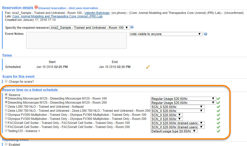 - Reserve time on a linked schedule: If there is another piece of equipment or schedule that needs to be reserved in addition to the current one, it may show as a linked schedule. Click the check box to view and reserve a linked schedule. Refer to Reserve multiple resources at once for more information.