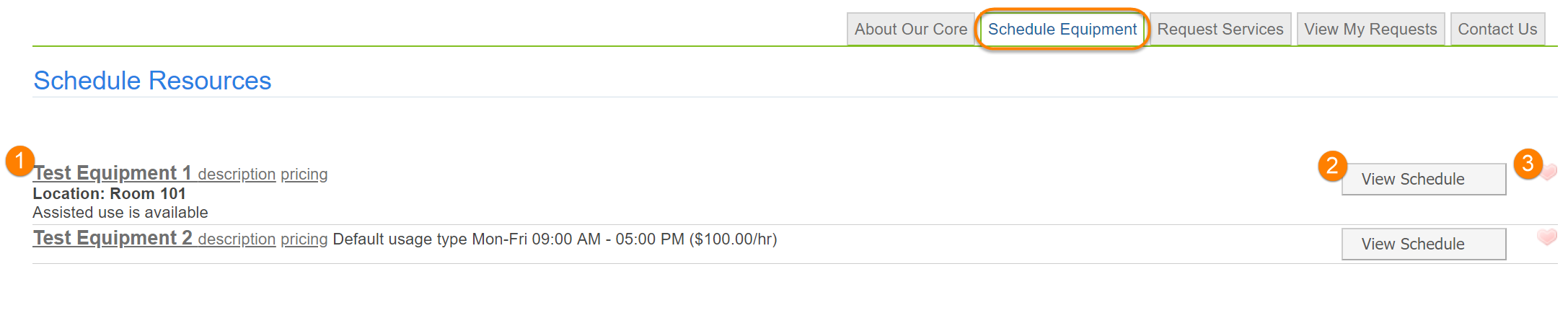 Access the calendar by clicking on the resource name or the "View Schedule" button.