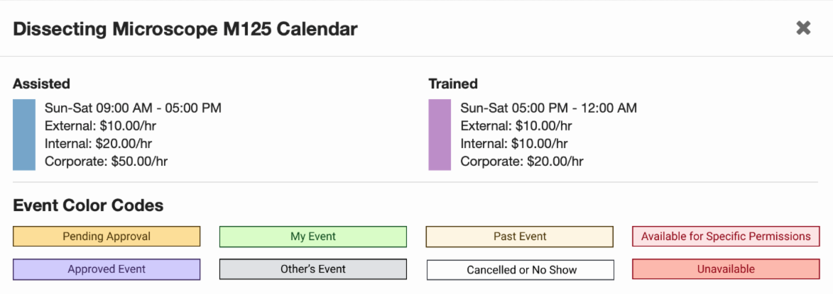 The Schedule Equipment tab is where Core Customers can review the schedules of a core's resources and make reservations. Note: this tab may be named differently for each specific core. If your core uses the iLab Kiosk, please see Using Kiosk for more information on starting sessions.