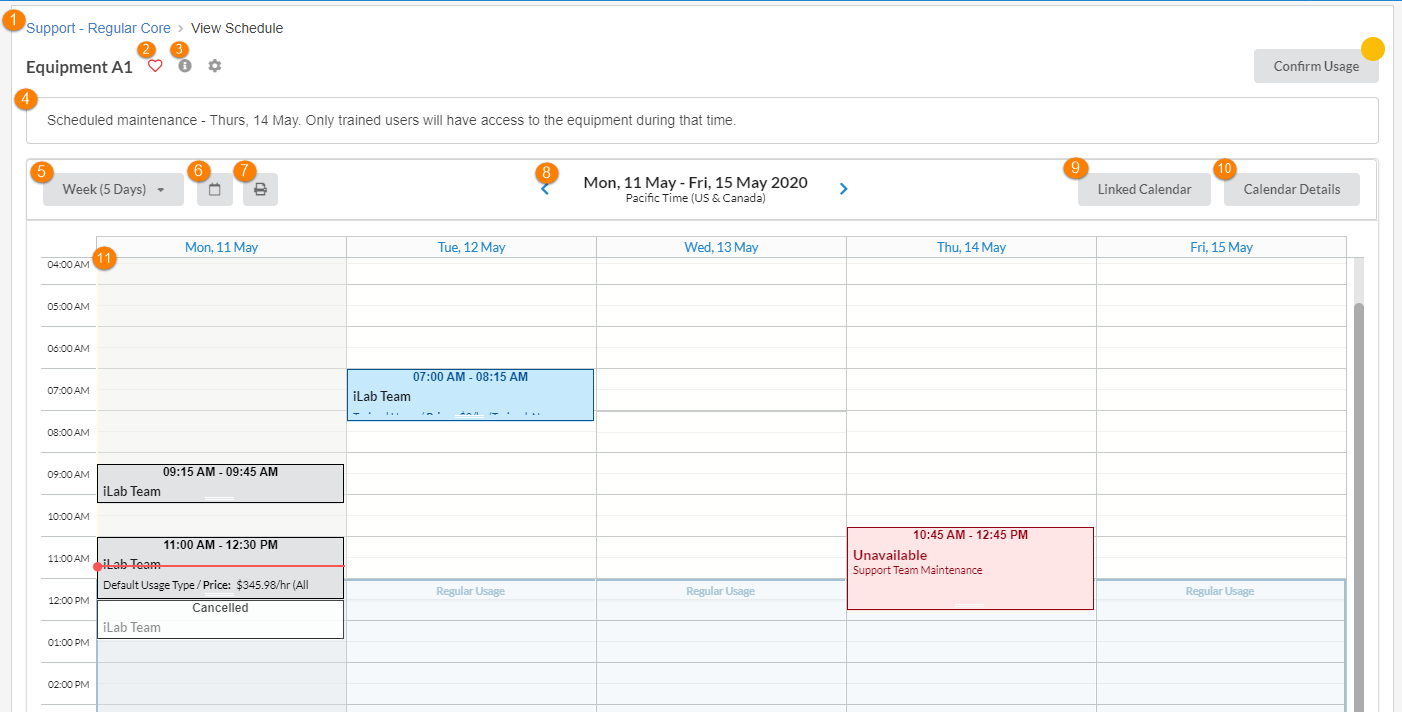 - Schedule Banner: Announcements regarding the equipment will be displayed in this section, if there are no announcements the sections will not be present.