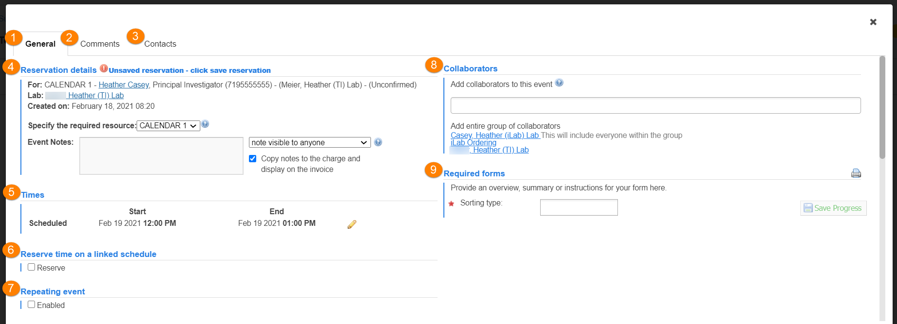 - Required forms: If the resource requires you to complete any forms, the will be listed in this panel on the right. Complete the fields, at a minimum the required fields marked with a red star (or the reservation cannot be saved)