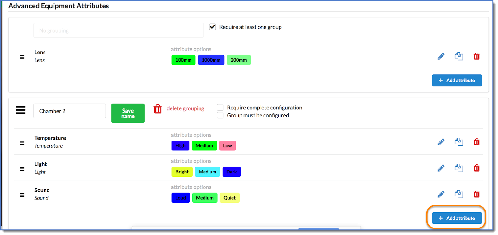 If you do not have one, start with your first grouping by typing a name and pressing the "Add grouping" button. If you want to require at least one grouping to be selected by users, click the "Require at least one group" check box. To create attributes under each grouping, press the "Add attribute" button.