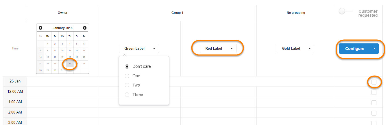 Go to the top. The configuration of the reservation displays at the top section. Check the boxes for the times that you wish to have that configuration. Press the "Configure" button.