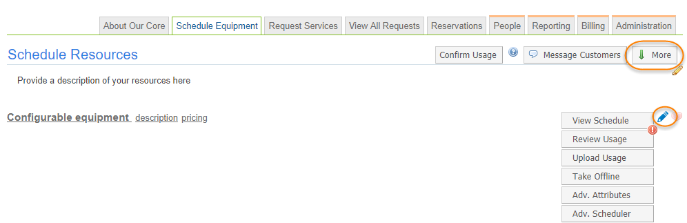 Once the feature has been turned on for your facility, you can configure your schedules under the equipment edits. To do this, navigate to your core’s Schedule Equipment tab and either click on "More" to add a new schedule or click on the pencil (edit) icon for existing equipment to access the schedule settings.