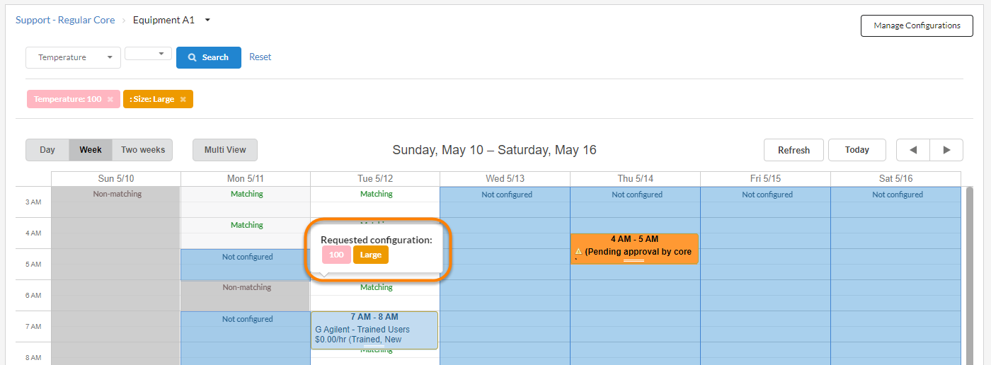 A configurable reservation provides advanced attributes that allow the core to set up specific parameters for a calendar. This feature allows administrators to plan specific configurations for complex equipment and allows users to request specific details to be assigned to a reservation or a resource that go beyond the normal availability for user type and hours of operation. Cores with instrumentation that requires significant setup would find the most benefit from this feature. Example: A core can set specific time on the calendar to one configuration (e.g. specific microscope head and specific material needed will only be available on Tuesday from 9 am- 3 pm) and then set another time on the calendar for another configuration of the instrument with different materials.