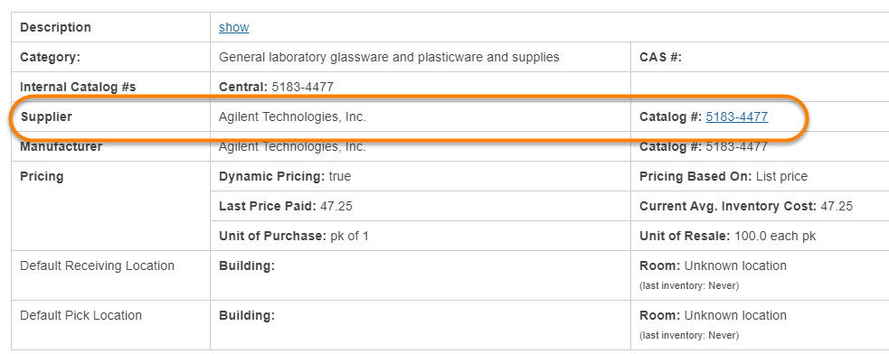 - Custom label for facility catalog number: A facility catalog number is an external catalog number that can be displayed for your product. This setting allows for the name to be customized. In this example, we named it "Test #". This will only show up if a facility catalog number is present within the product information.