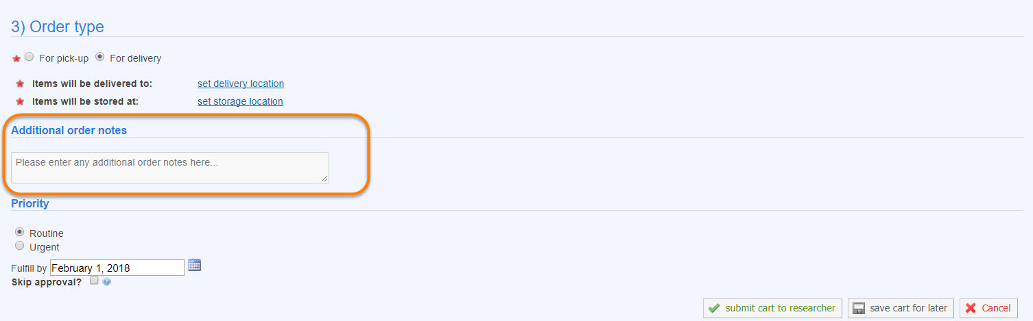 - Prompt for additional order notes text area: Enter the text you would like to use to prompt your users to enter additional text, if necessary.