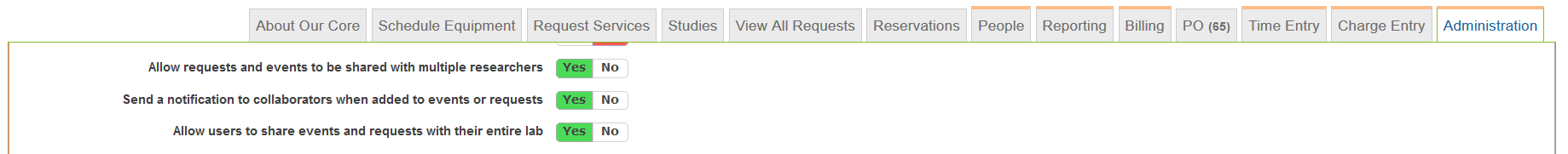 The collaboration settings are housed under the iLab use only section on the Administration tab. You will be able to see the settings but will need to contact an iLab associate to change any of the settings regarding collaboration on requests and reservations.
