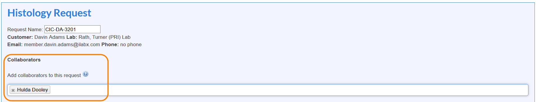 When a request or reservation is initiated there will be a collaborators section. In this section the person initiating the request or reservation will be able to search for other users to add as collaborators. If the user has added collaborators before, past collaborators will be displayed in a drop down list when they click in the search box, they can also type in the search box to find additional users they have not previously collaborated with. If the user has not added collaborators before they will start typing in the search box to find the fellow users to add as collaborators.