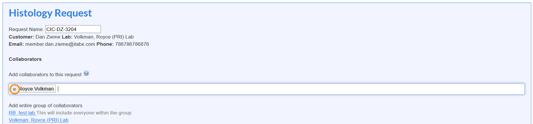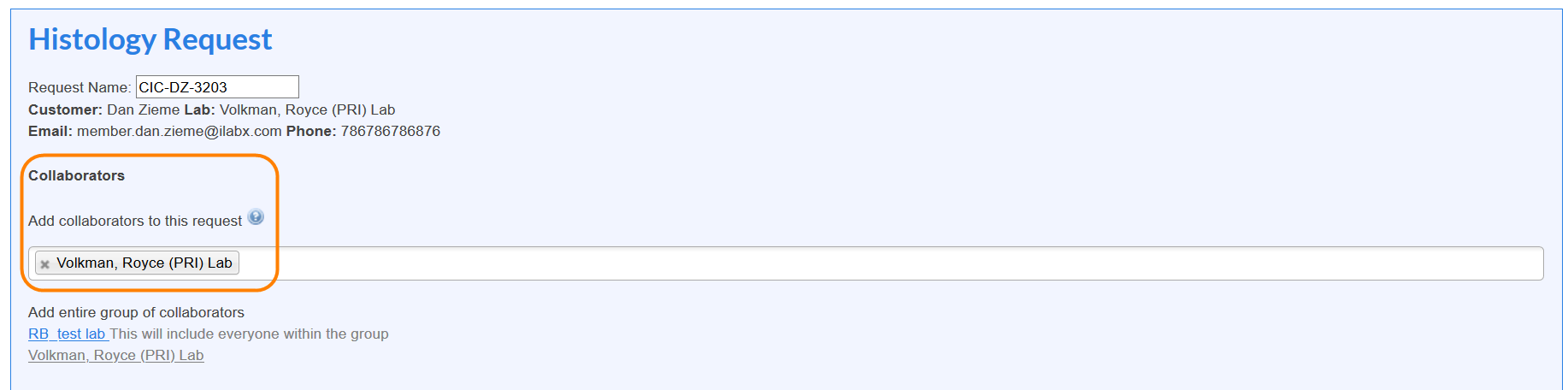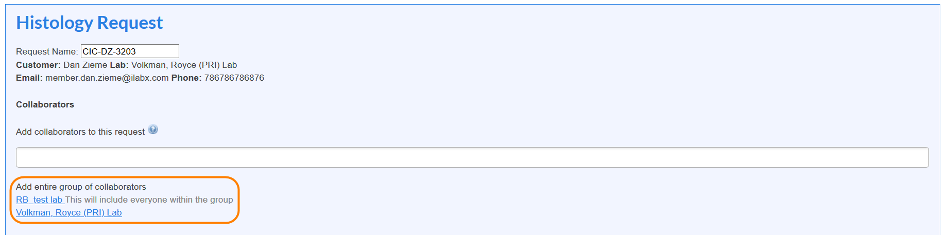 You have the ability to allow users to add an entire lab/group as collaborators in addition to adding individual users. When initiating a request or reservation there will be an option under the collaborators section to Add an entire group of collaborators. This will include everyone in the group/lab as a collaborator.