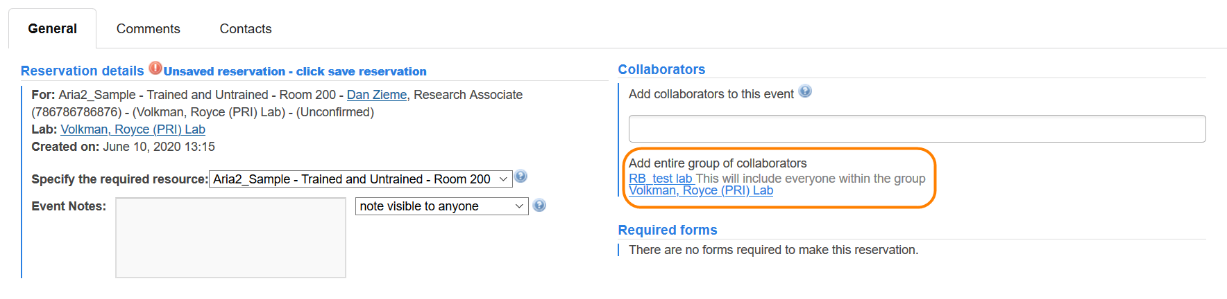 Allow users to share events and requests with their entire lab: When searching to add collaborators to a reservation or request a user will have the option to search for and collaborate with their entire lab. There will be a list of the user's group(s)/lab(s) under the search option that the user can click to quickly add their full group/lab as a collaborator.