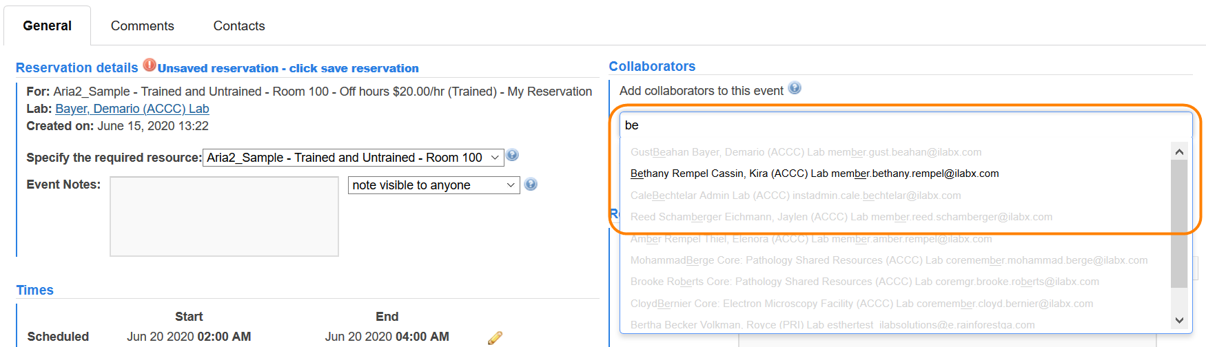 Allow requests and events to be shared with multiple researchers: The user initiating the request or reservation will have the ability to add other researchers as collaborators. These researchers can be from the users same lab, other labs at the user's institution, or external to the user's institution.