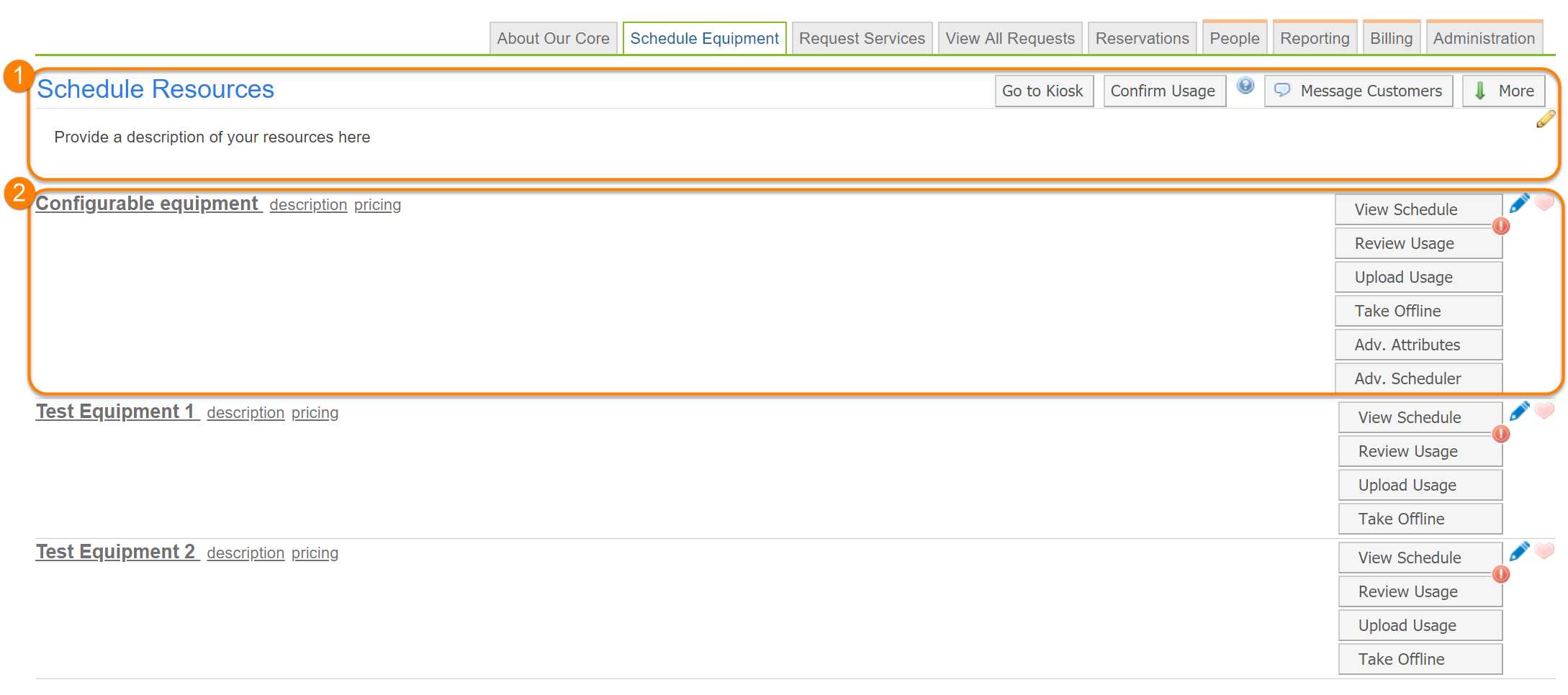 As a core administrator, the Schedule Equipment tab is used to create reservations, perform usage uploads, view and confirm usage, and edit calendar settings for core equipment. This page can also be accessed by core customers to create reservation(s) on equipment (see Schedule Equipment), though various functions and options used by administrators will not be available to customers. If scheduling has been enabled within your core, the Schedule Equipment tab will be displayed after accessing the core. The Schedule Equipment tab is accessed from your core's homepage. Because this tab can be renamed in the administrative Scheduling settings, it may be labeled differently within your core.