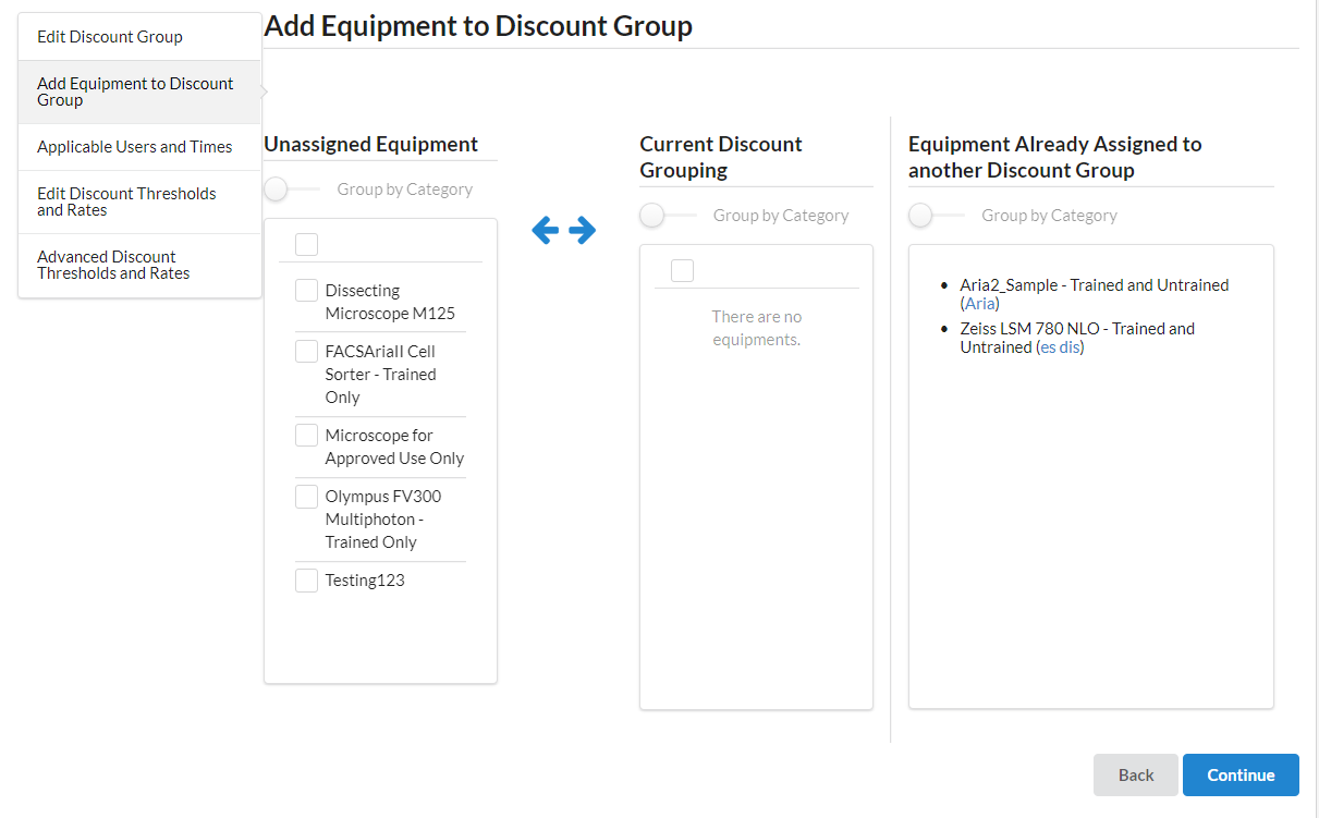 To remove a piece of equipment from this discount group, select the piece of equipment by checking the box beside the equipment in the "Current Discount Group" box on the right. Then, click the left blue arrow. The piece of equipment will now display in the "Unassigned Equipment" box.
