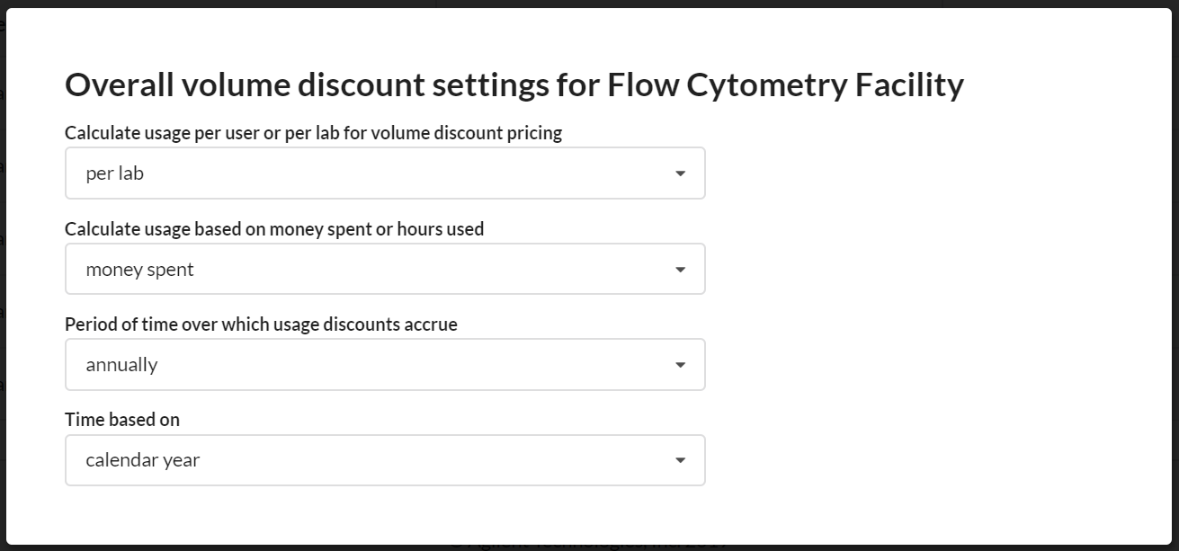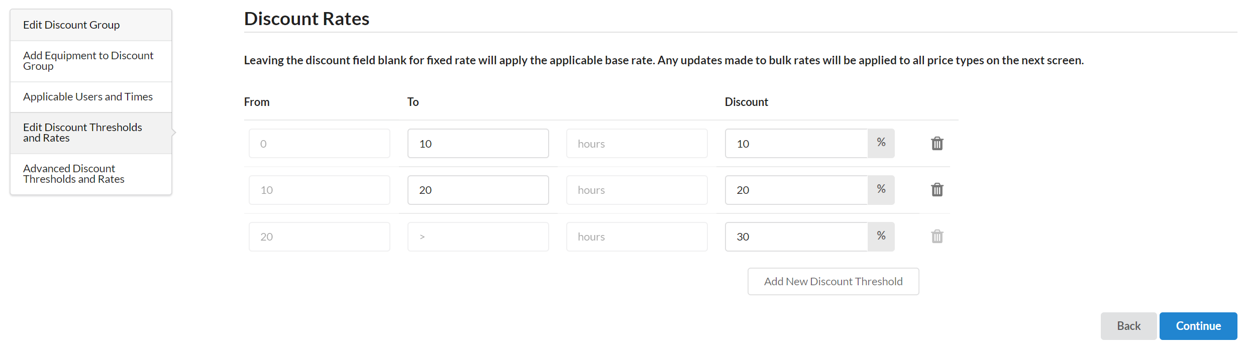 In the Advanced Discount Thresholds and Rates section, you can adjust the percentage discount rate by Usage Type and Price Type. This will allow you to give specific users more or less of a discount.