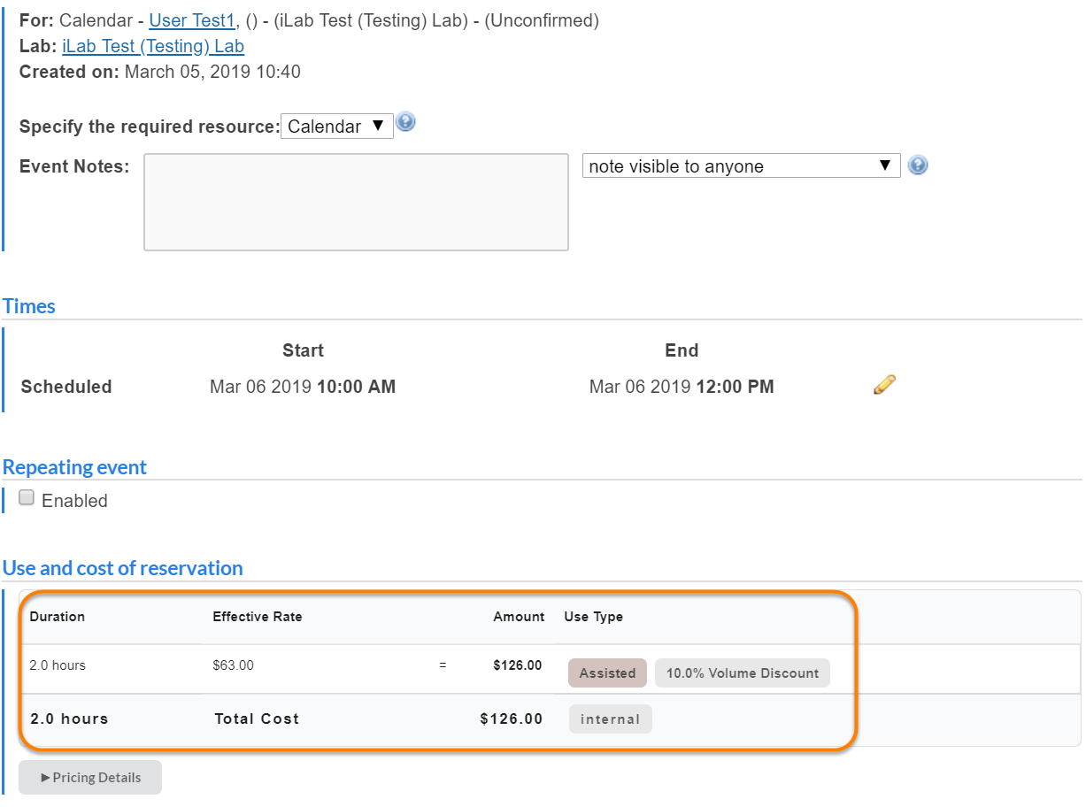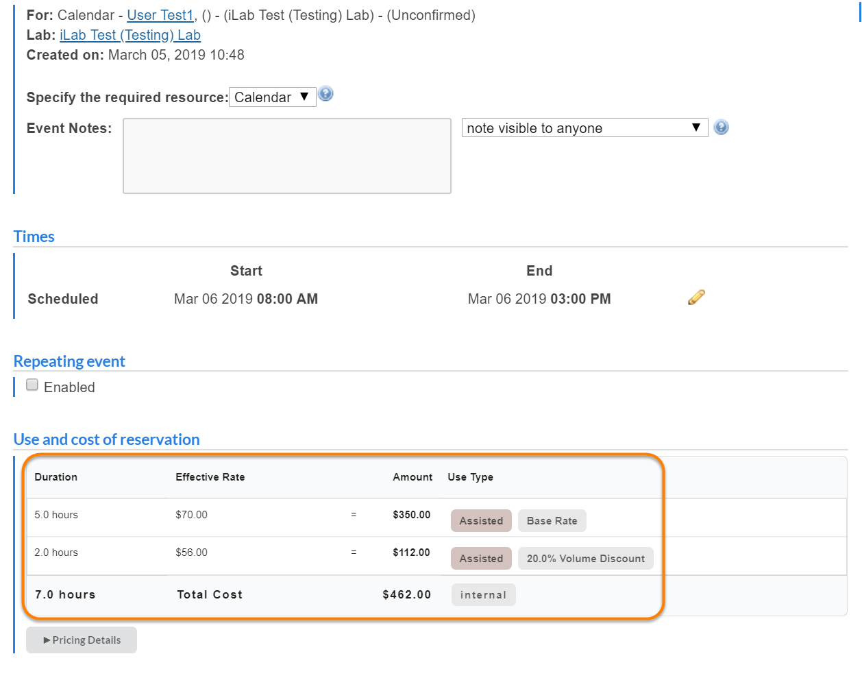 Volume Discounts allows the option to set up multiple discount groups at the core with various equipment, discount thresholds, and rates. As users schedule time on equipment calendars, they may reach a threshold when their new reservations are eligible for a volume discount. Volume discounts will be automatically applied to user reservations when conditions for application are met. Users and managers can view a summary of applied discounts on an event from the moment it is scheduled until the user is invoiced.