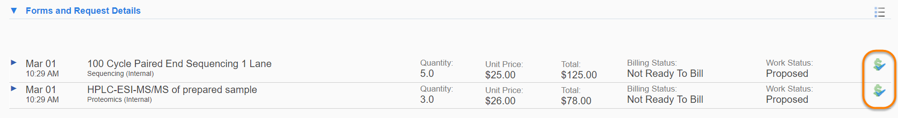 To change the Fund/Payment information that applies to an entire Service Request, find the request in the View All Requests tab of your core, and then click the dollar icon for that request: