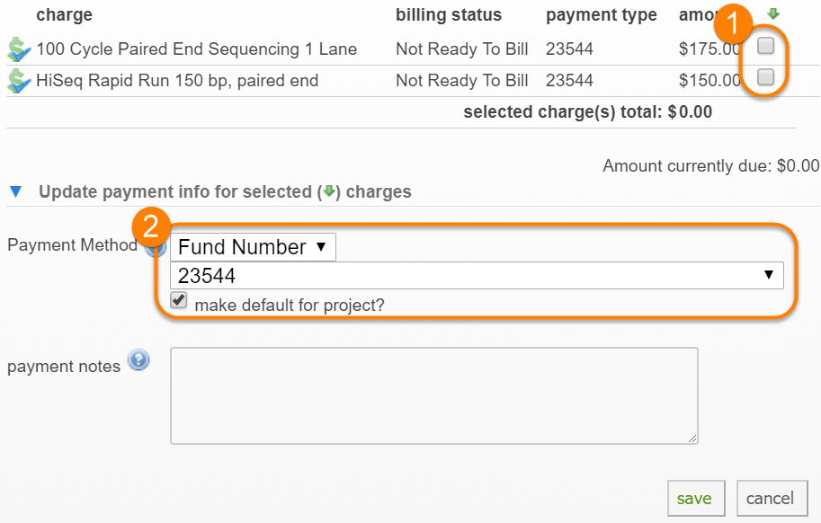There are times when payment information changes or was not entered and it becomes necessary to add or update payment information. Changing the fund/payment information on service request or individual charges can be done up to the point where the charges are successfully billed. Information can be updated by the user, core staff, or PI/Lab Manager.
