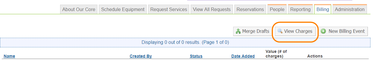 The "View Charges" button is found on the Billing tab. The "View Charges" button will display all confirmed and completed charges that have not yet been added to a billing event. This is helpful for groups that like to look over their charges prior to creating a billing event.