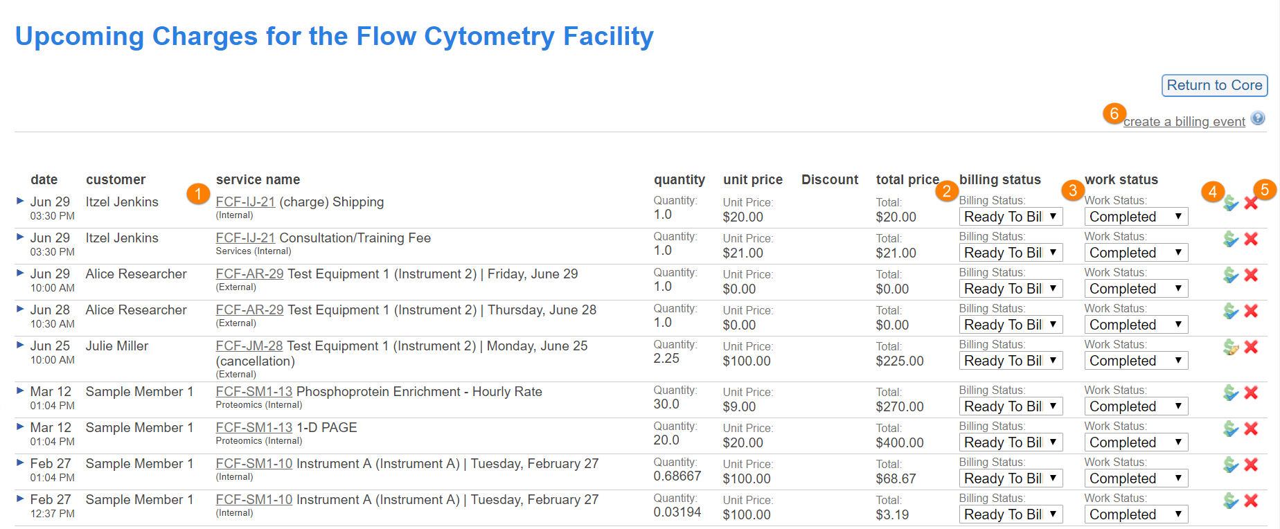 A list of all confirmed equipment and completed service charges will display. There are many actions you may take on a charge from the list of upcoming charges: