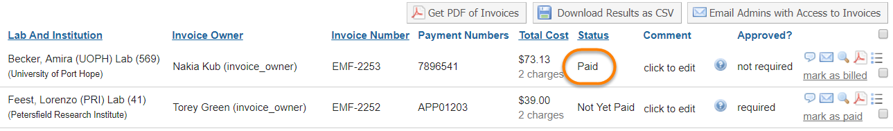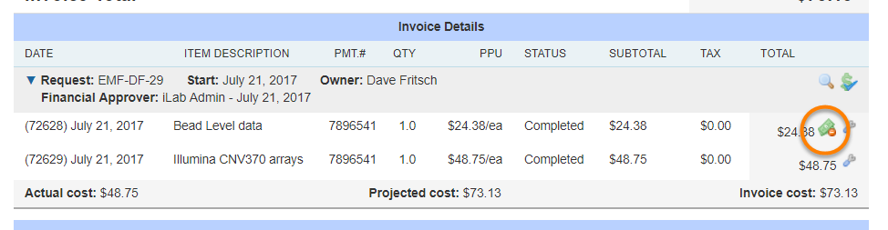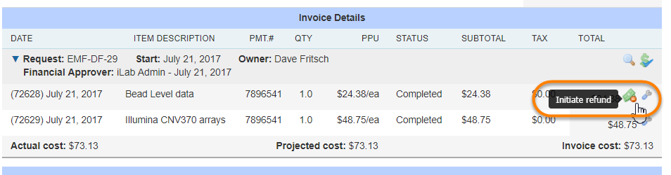 Administrators can search for the invoice which requires a refund either from the billing event list view or from the invoices list view on the left side of their iLab page. After navigating to the invoice, hover over the charge that needs to be refunded to display the initiate refund icon.
