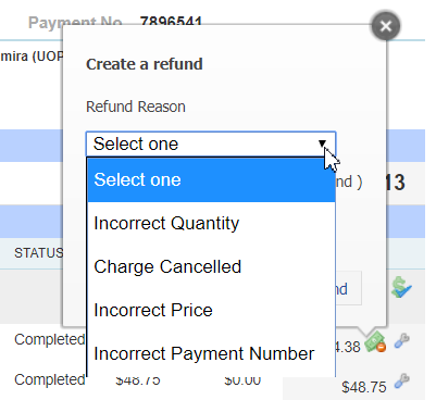 Once the refund icon is clicked you will be prompted to select the reason for the refund from the drop down box for tracking purposes and then enter in the quantity of the charge the needs to be refunded.