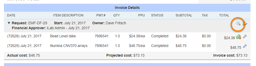 To view the newly created refund line item click on the magnifying glass icon above the line item. The request view will open in a new tab.