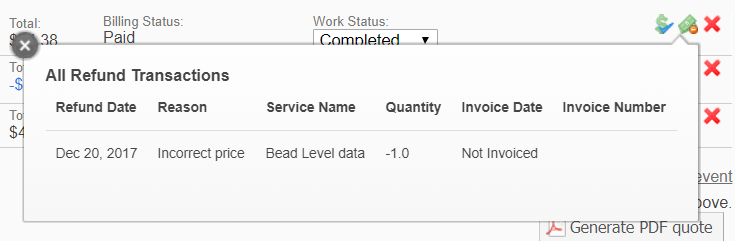 Once a charge is refunded, the refunded charge and added refund line items will be visible on the request and invoice. All administrators, including customer administration, with access to the request or invoice will be able to see the refund icon and click on it to review the refund summary.