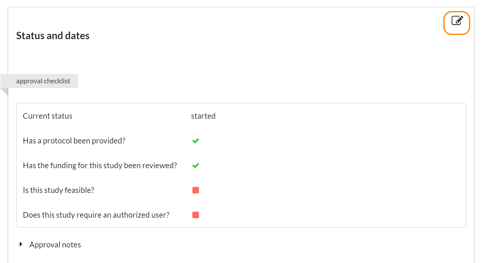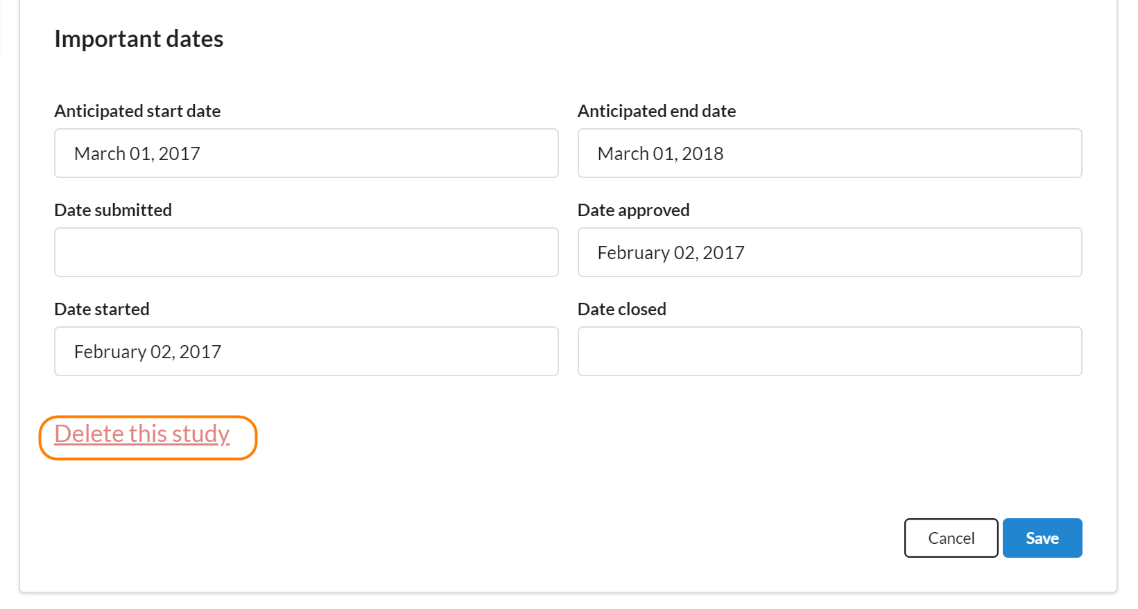 If you need to delete a study, click the pencil edit icon in the Status and Dates section.