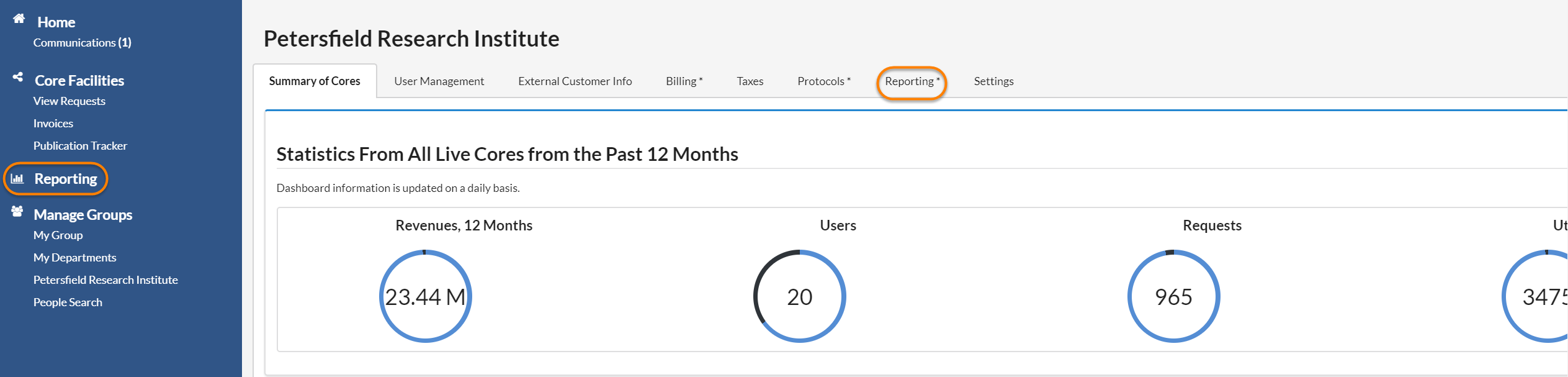 As an Institution Administrator you have the ability to run reports for your entire institution. You can access reporting from the Institution Dashboard or through the link in the left side menu.