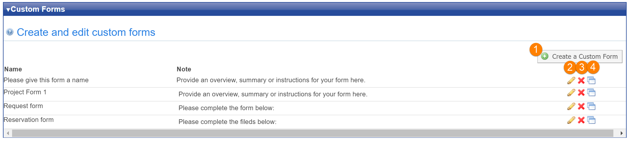 - Create: Click the "Create a Custom Form" button to add a new form.