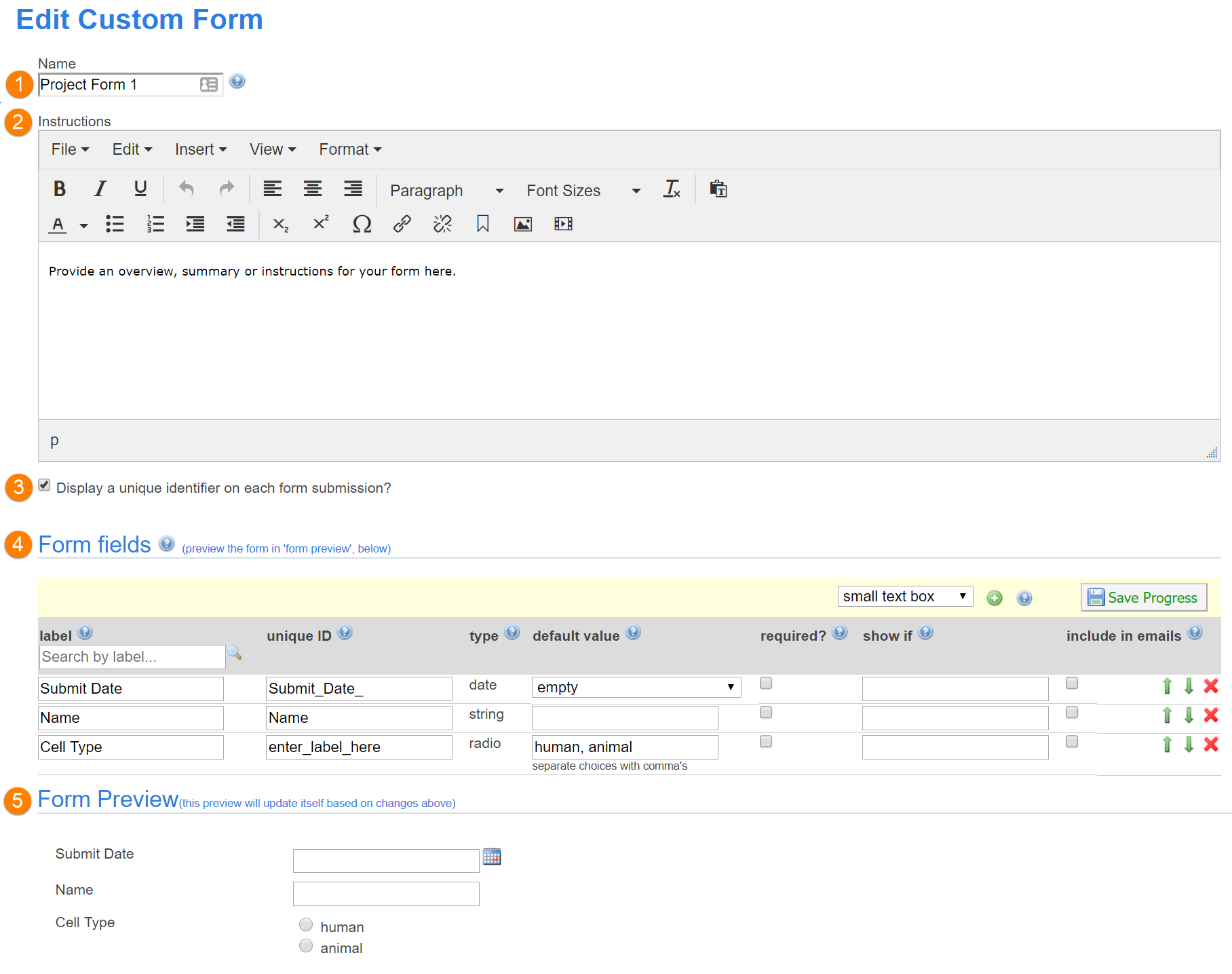 When you create a new form or edit an existing form, you be brought to the Edit Custom Form interface: