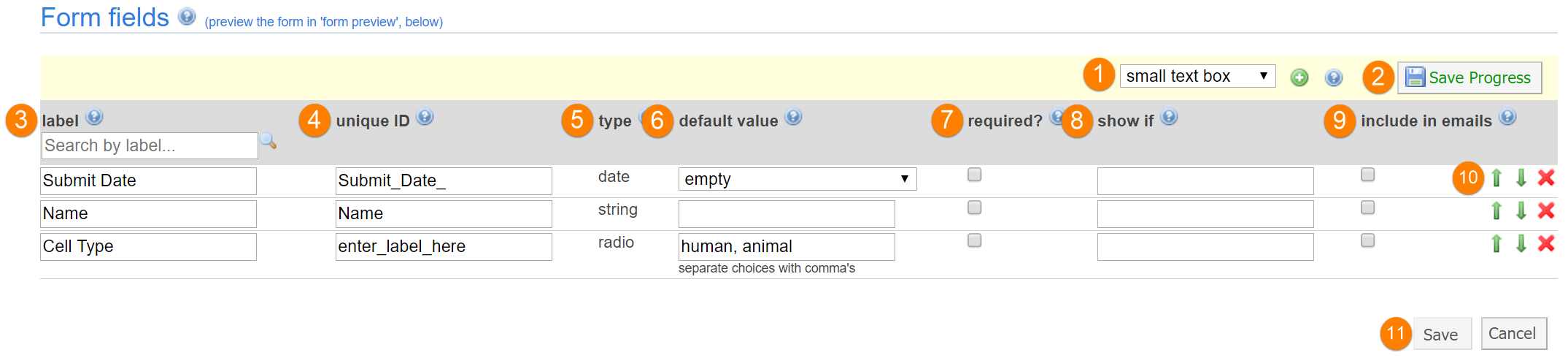 - Save and Cancel: Click "Save" to finish editing the form and go back to the Administration tab. Click cancel to close the form without keeping any of the changes you made.