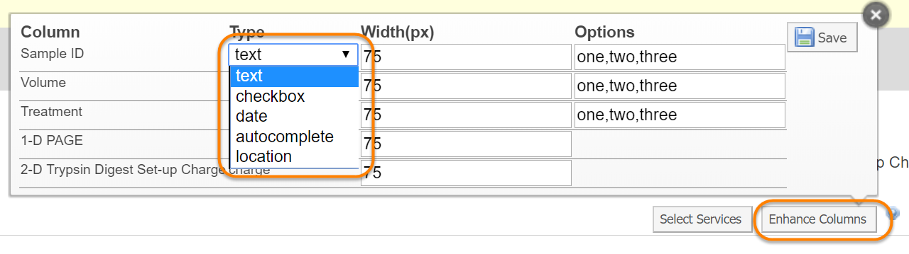 - autocomplete: a text field that auto-completes based on the entries in the Options column.