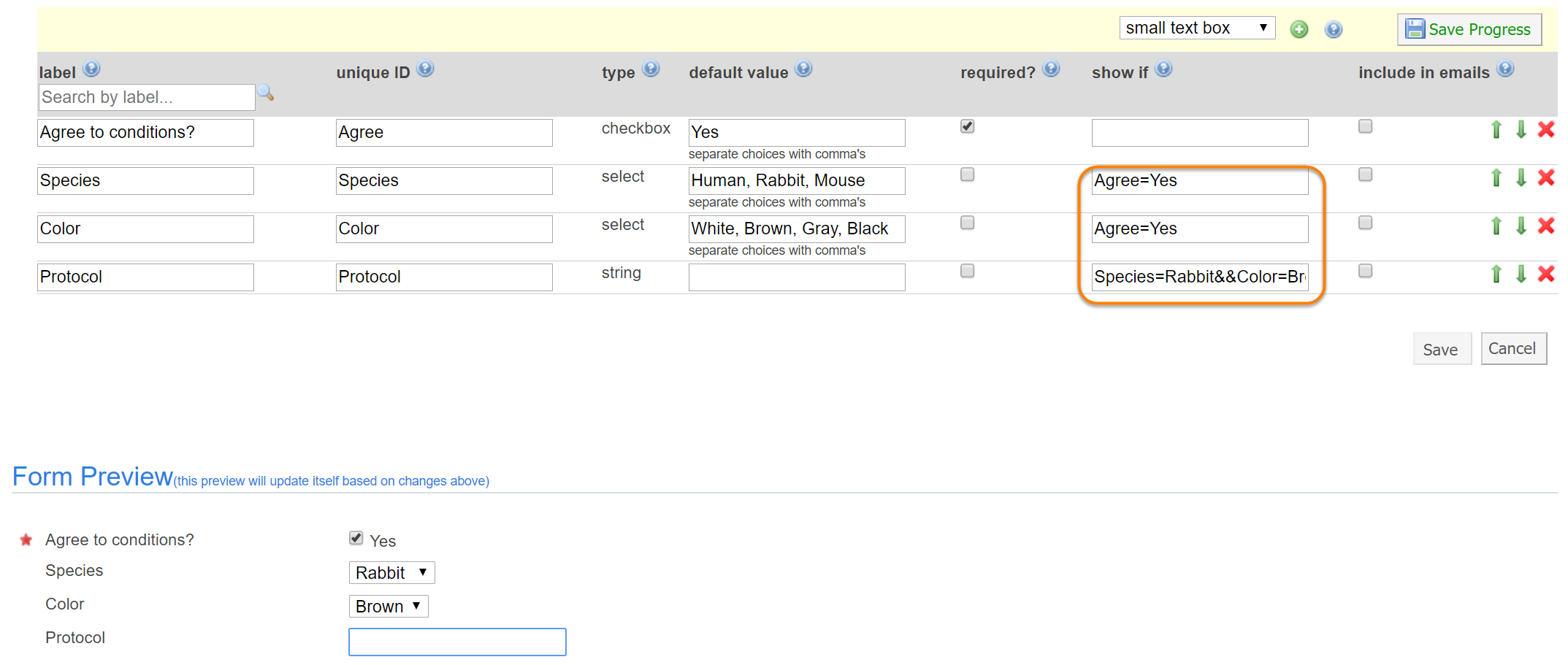 For example, if you are creating a new field that should only be shown if the user agrees to certain conditions (as captured in a checkbox field with unique ID "Agree"), you should type 'Agree=Yes' in the show if field. Note that for show if statements to work properly, each unique ID value must be different within one form and must be entered in the show if exactly as it displays in the unique ID field.
