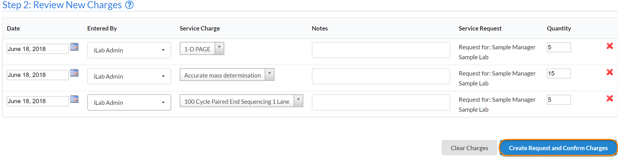 When you have added the charges to the list, review them in the panel below and make any modification or delete them with the red "X" on the right. Once finalized, click Create Request and Confirm Charges.