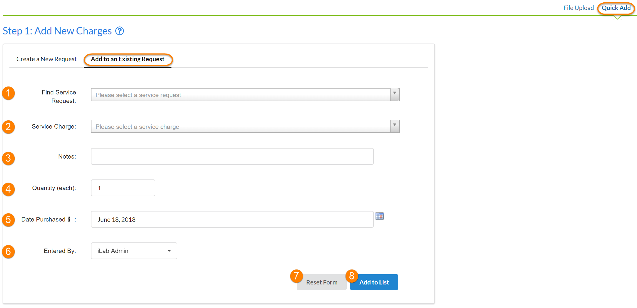 There are two ways of adding charges using Quick Add: adding them to a new request or adding them to an existing request.
