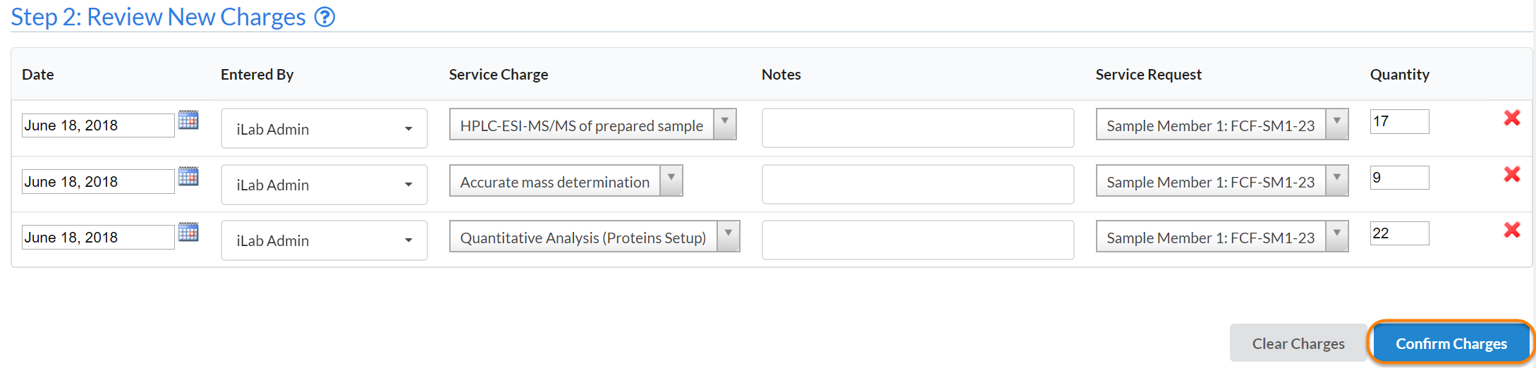 When you have added the charges to the list, review them in the panel below and make any modification or delete them with the red "X" on the right. Once finalized, click Confirm Charges.