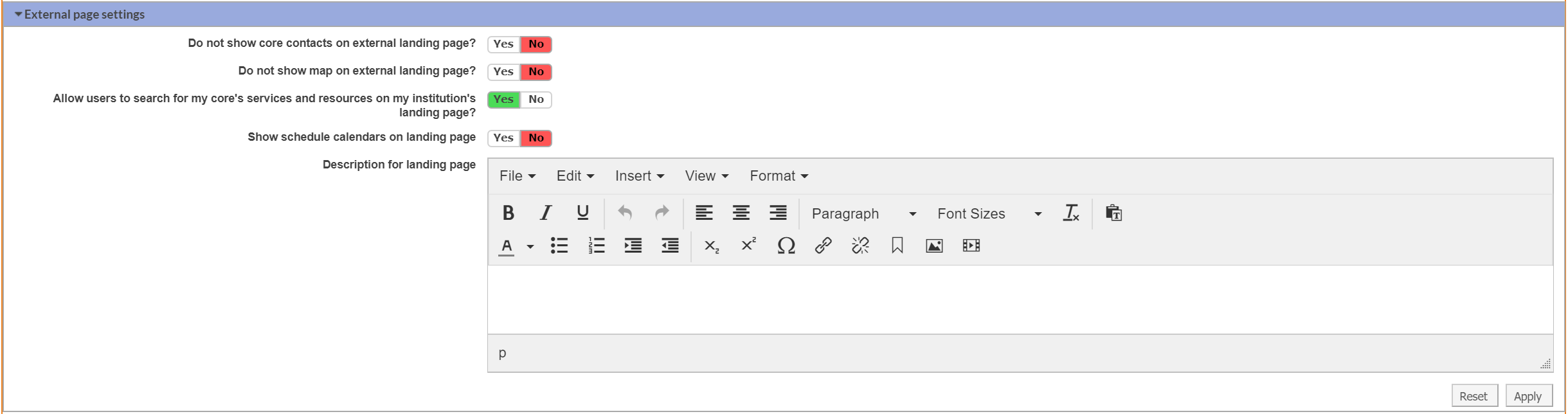 - Allow users to search for my core's services and resources on my institution's landing page?: If you wish to allow external customers to search for your core and its services from the institution's landing page, select YES.