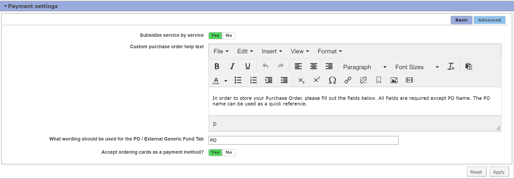 - Custom purchase order help text: Enter the text you would like to use to help users enter their PO information. These directions will display when a user clicks to add a new PO.