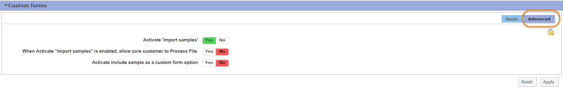 - Activate 'import samples': Indicate whether you would like to allow users to import samples to submit with their custom form. If set to YES, you can now go to Custom Forms panel and see import samples as a drop-down in the custom form. Staff is able to process the samples and each sample is given a unique identifier. If this setting is set to YES, the next setting will automatically populate.