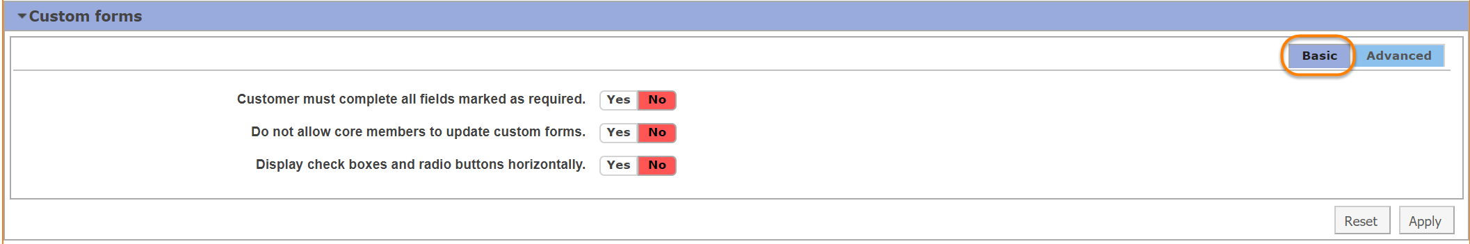 The "Custom Forms" sub-group of the "Other Settings" panel defines the behavior for any custom forms that are created for your core. The settings are separated into two groups, Basic and Advanced. Please contact iLab support to access the 'Advanced' setting options.