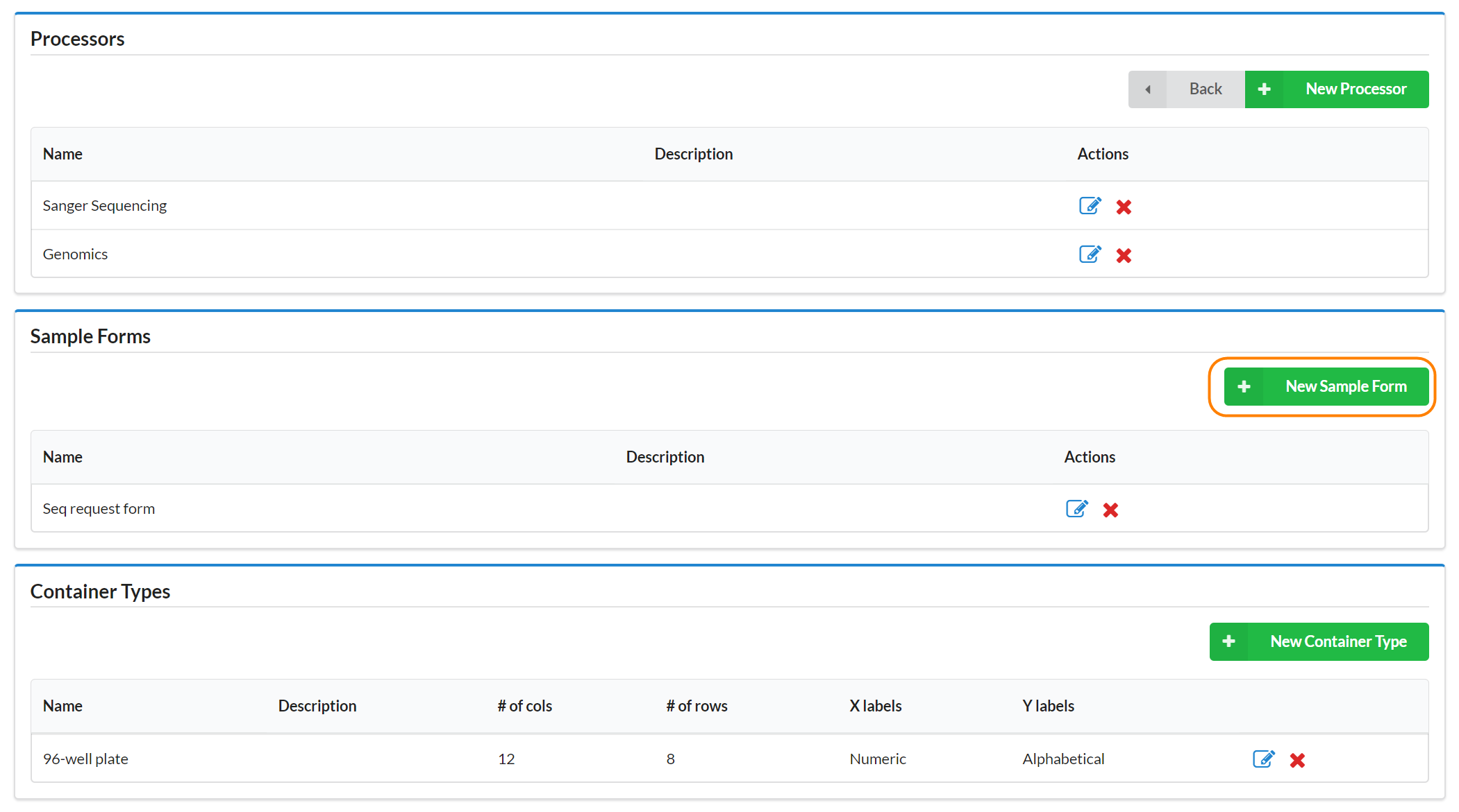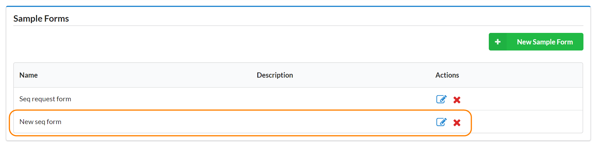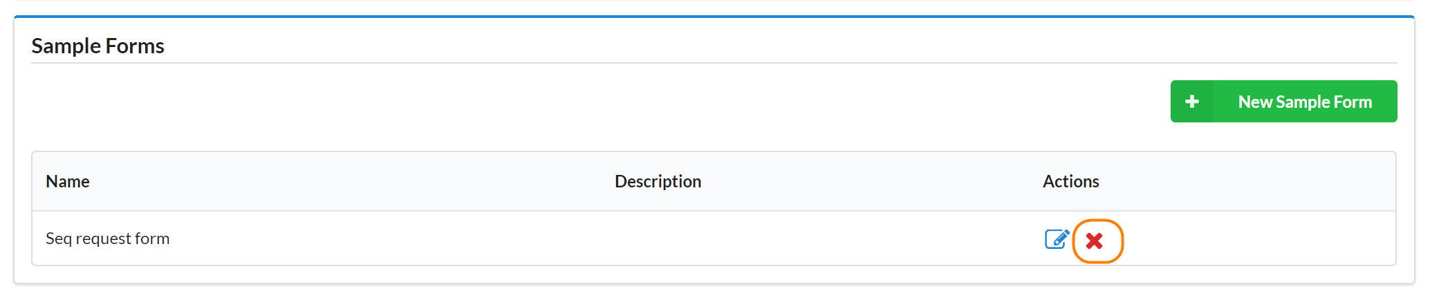 You may also delete a sample form by clicking the red x in the Actions column.