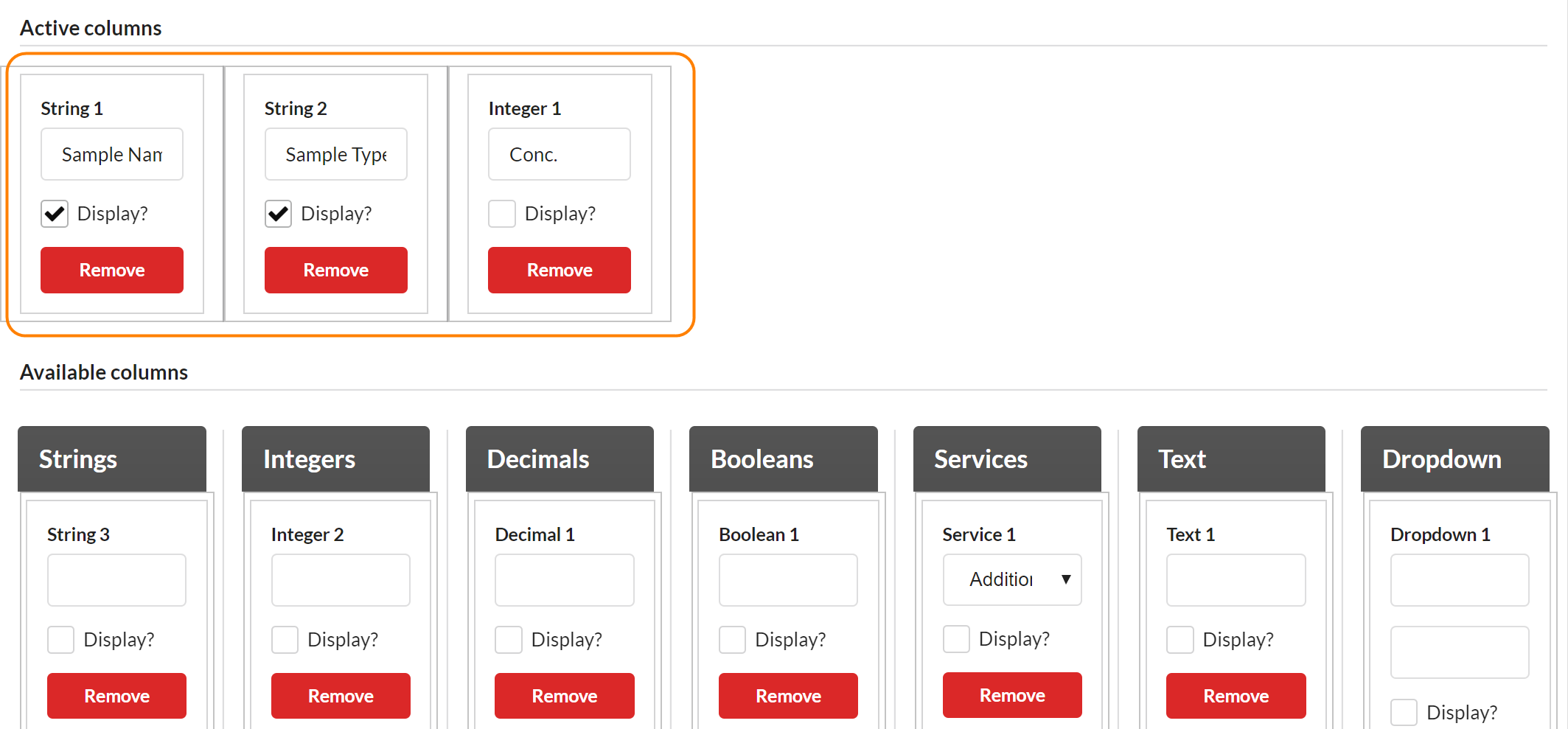 Once you have defined your form fields, you will need to add them to the Active Columns section. To do so, put your cursor on the column header (i.e. "String 1", "Integer 2", etc.), click, and drag the item into the Active Columns section, and arrange them in the order you would like them to display in the request form. You can rearrange the fields within the box by dragging them left or right. You can also remove a field from the box by clicking the red "Remove" box.