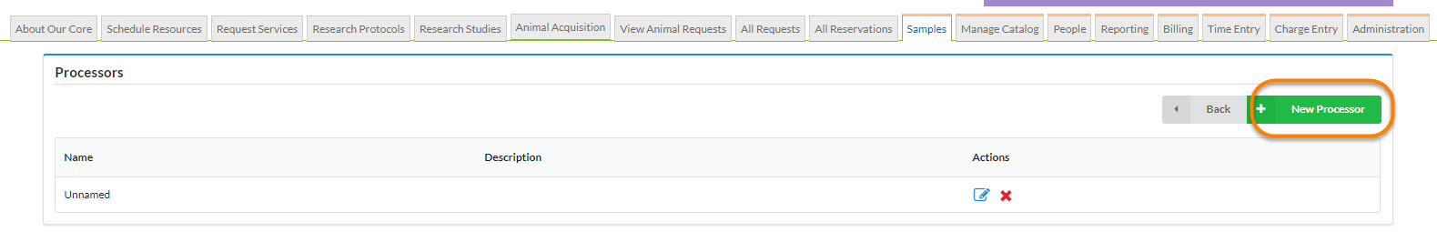 A processor is a core-built automator that defines how to process/manage samples, and creating one is the final step in constructing your sample processing workflow. The creation of a processor allows you to flexibly combine a container type with a sample request form for different types of customer project requests.