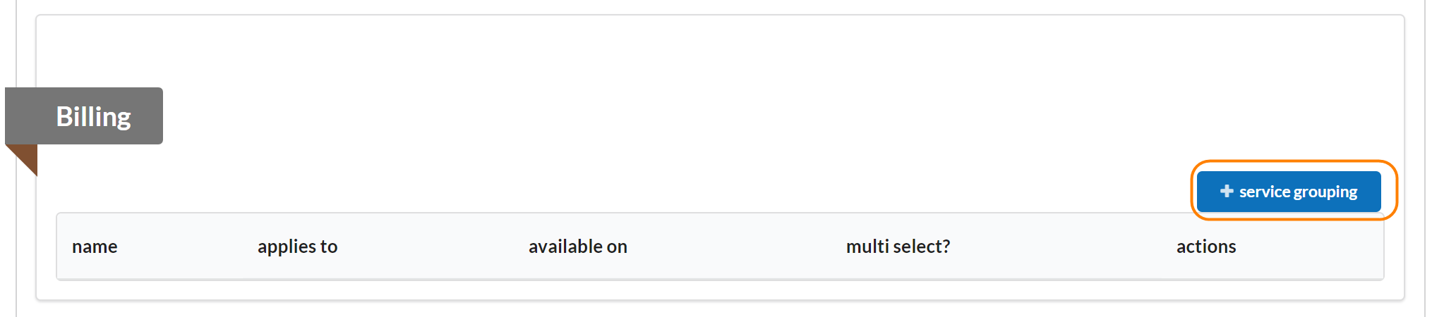 Service groupings are a set of services used together on a single request. To create a new service grouping, click the Service Grouping button within the Billing section.